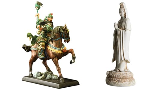 3. เทพกวนอูและเจ้าแม่กวนอิม ถือเป็นสองเทพในตำนานที่ชาวจีนทุกผู้ทุกคนนับถือเป็นอย่างมาก โดยทั้งสองท่านนั้นมีตัวตนจริงๆในประวัติศาสตร์ของคนจีน กวนอูนั้นเป็นแม่ทัพคู่ใจของเล่าปี่กษัตริย์ของจ๊กก๊ก หนึ่งในก๊กใหญ่ของสามก๊ก โดยกวนอูนั้นได้รับความยอมรับว่าเป็นผู้ที่มีความซื่อสัตย์ มั่นคง จงรักภักดี ยึดมั่นในคำสัญญา กตัญญูรู้คุณ และมีคุณธรรม เพราะไม่ว่าจะอยู่ในสถานการณ์ใดทั้งดีหรือร้าย กวนอูจะต้องยึดมั่นในคำสัญญาที่ให้ไว้กับเล่าปี่ว่าจะร่วมเคียงบ่าเคียงไหล่ในสนามรบไปจนวันตาย ชาวจีนนับถือกวนอูเป็นอย่างมาก จนในยุคสมัยของเฉียนหลงฮ่องเต้ของราชวงศ์ชิง จึงได้เคารพบูชากวนอูให้เป็น “เทพกวนอู” เทพเจ้าแห่งความซื่อสัตย์
