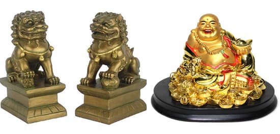 4. สิงโตทองคำ ตามความเชื่อของคนจีนนั้นถือว่าสิงโตเป็นสัญลักษณ์แสดงถึงความมีพลัง มีอำนาจ น่าเกรงขาม เพราะเป็นราชาแห่งสัตว์ทั้งมวล แต่สำหรับนักดูฮวงจุ้ยในระบบวิชาการนั้นมองว่ารูปร่าง รูปทรง ของสิงโตทองคำนั้นจะมีลักษณะกลมทั้งศีรษะ ขน ลำตัว ขา ผิวภายมันวาว เคลือบสีส่วนใหญ่เป็นสีทอง จึงดูภาพรวมเป็นลักษณะพลังของ “ธาตุทอง” สามารถใช้ในการเสริมพลังเกี่ยวกับ การตัดสินใจที่ฉับไว รวดเร็ว คล่องแคล่ว มีความเด็ดขาด ยุติธรรม มีอำนาจ โดยทิศทางที่สามารถใช้สิงโตทองคำเสริมพลังได้ดีได้แก่ “ทิศตะวันตก” เน้นสำหรับผู้หญิง หรือ “ทิศตะวันตกเฉียงเหนือ” เน้นสำหรับผู้ชาย และจะส่งผลดีเป็นพิเศษกับผู้ที่เกิดในปี “วอก” “ระกา” หรือ “จอ” โดยวัสดุมงคลอื่นๆที่ดูมีลักษณะมีพลัง มีความกลม มันวาว ก็สามารถพิจาณาใช้ได้ เช่น พระสังกัจจายน์เป็นต้น